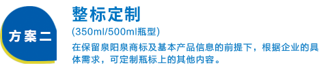 兩種定制方案靈活可選,為您量身定做企業(yè)專屬的長白山天然礦泉水,展現(xiàn)企業(yè)個(gè)性,彰顯企業(yè)文化,提升企業(yè)形象,助力商務(wù)成功!
